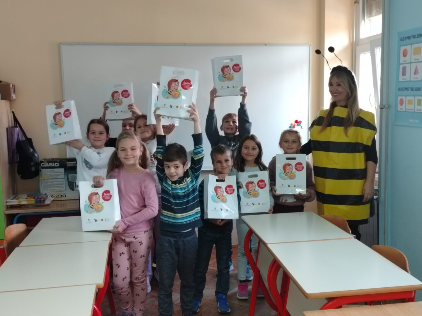 Obilježili smo Školski medni dan. Prvašići su naučili od koga i kako to nama stiže med te zašto ga moramo jesi i kad nismo bolesni. Vrijeme darivanja je pa su i danas išli kući sa slatkim proizvodom, ovaj put od pčelica i zdravim.
